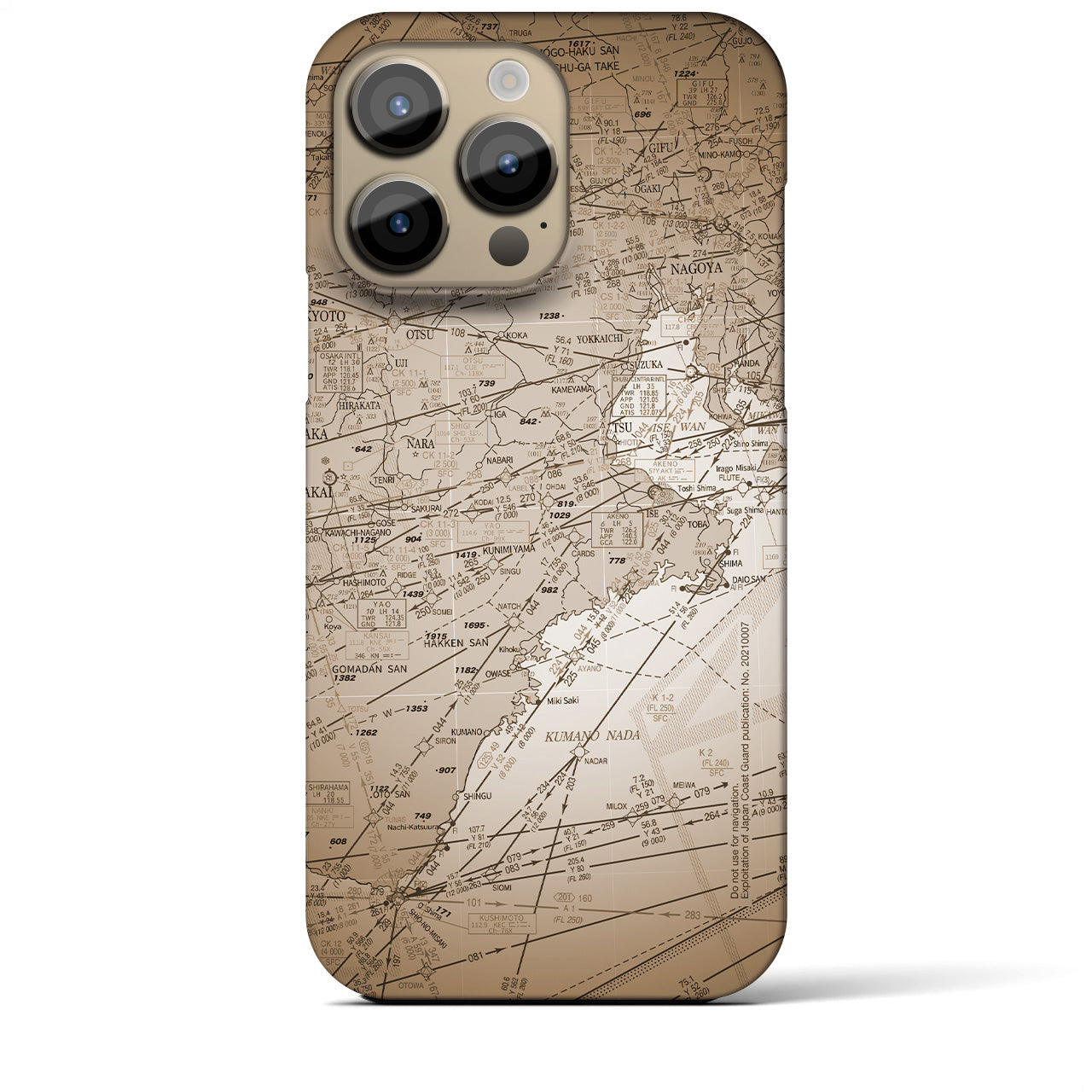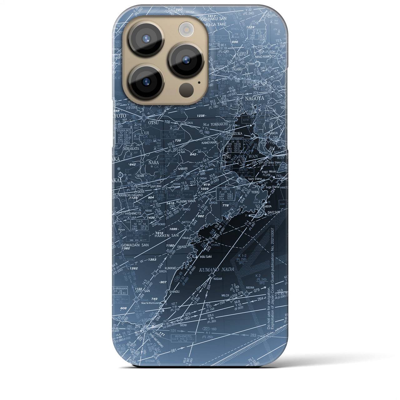 名古屋を中心としたエリアの航空図が全面に描かれたバックカバータイプの地図柄iPhoneケースです。海上保安庁発行の航空図を緻密にリライトしたグラフィックがスリムなシルエットの側面まで回り込み、眺めているだけでフライトの世界に引き込まれます。