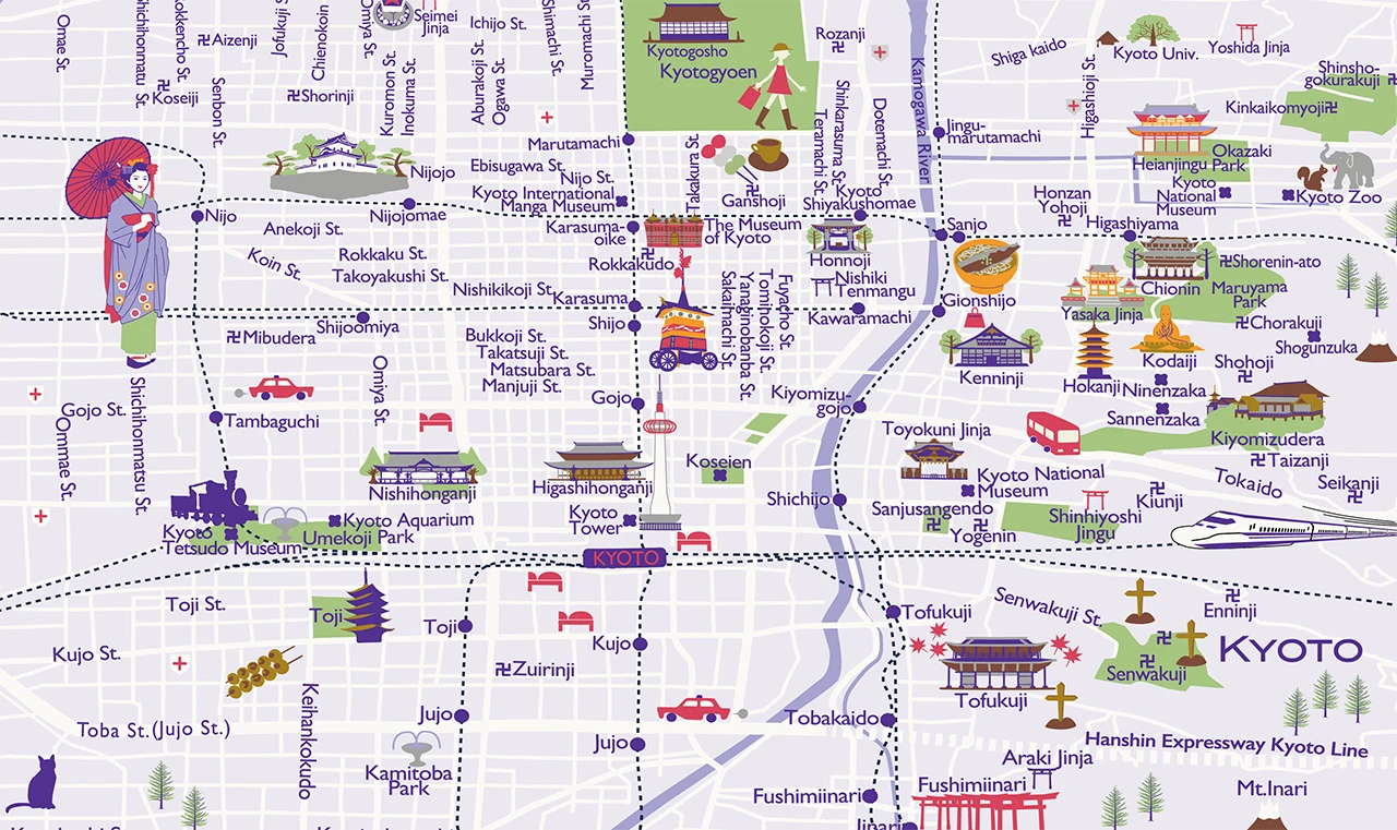 totemapとのコラボレーションで生まれた京都のカラフルな地図柄Tシャツです。