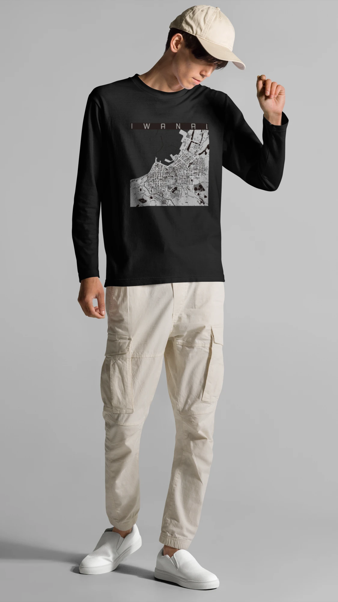 幅広いシーズンにフィットする長袖Tシャツにあなたの街「岩内」のモノトーンマップをプリントしました。