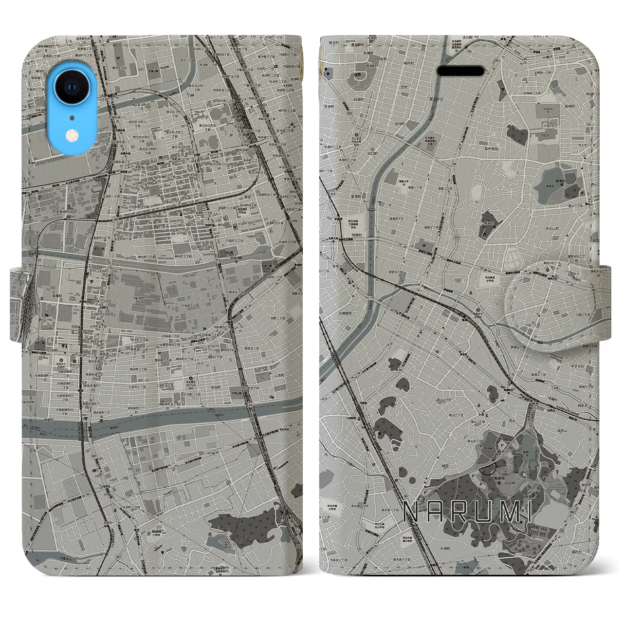思い出の街、今を暮らす街、あなたが愛する「鳴海」の手帳タイプ地図柄iPhoneケースです。両面にまたがる大きなプリントで、離れていても「鳴海」をいつも身近に感じさせてくれます。