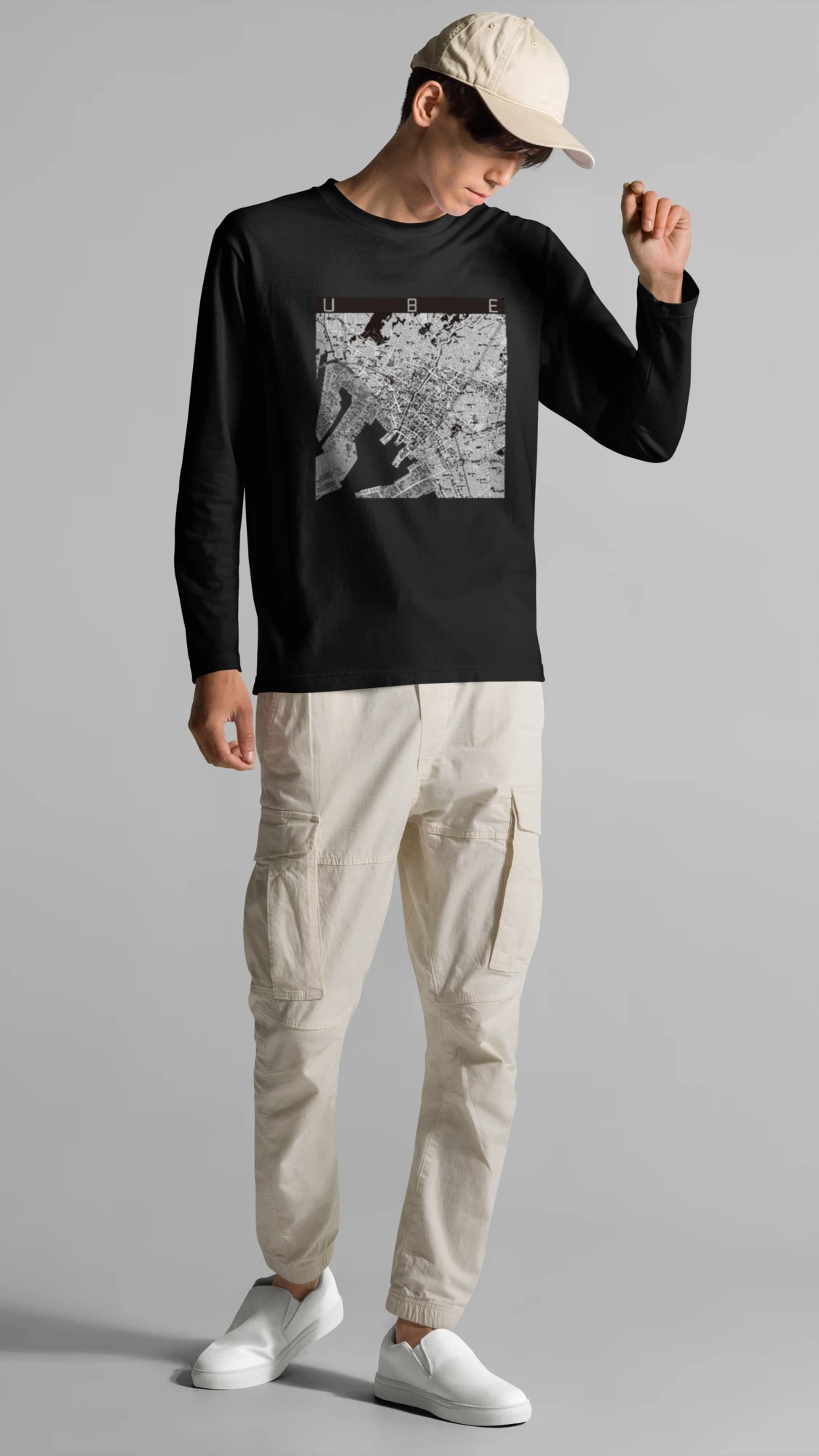 幅広いシーズンにフィットする長袖Tシャツにあなたの街「宇部」のモノトーンマップをプリントしました。