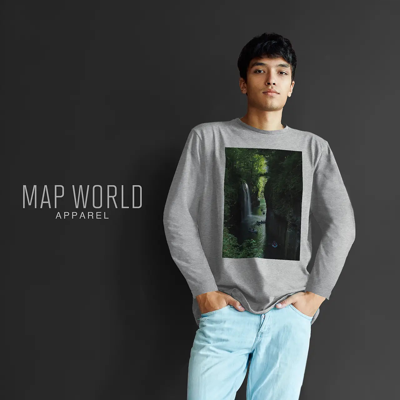 その高千穂峡の絶景を、幅広いシーズンにフィットする長袖Tシャツのフロントに大胆に配しました。しっかりした生地感の5.6オンスボディは一枚で着てもレイヤードにしてもOK。鮮やかなプリントで気分が上がる一枚です。