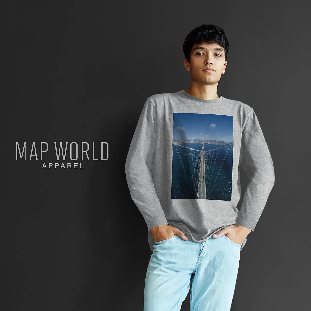 その明石海峡の絶景を、幅広いシーズンにフィットする長袖Tシャツのフロントに大胆に配しました。しっかりした生地感の5.6オンスボディは一枚で着てもレイヤードにしてもOK。鮮やかなプリントで気分が上がる一枚です。