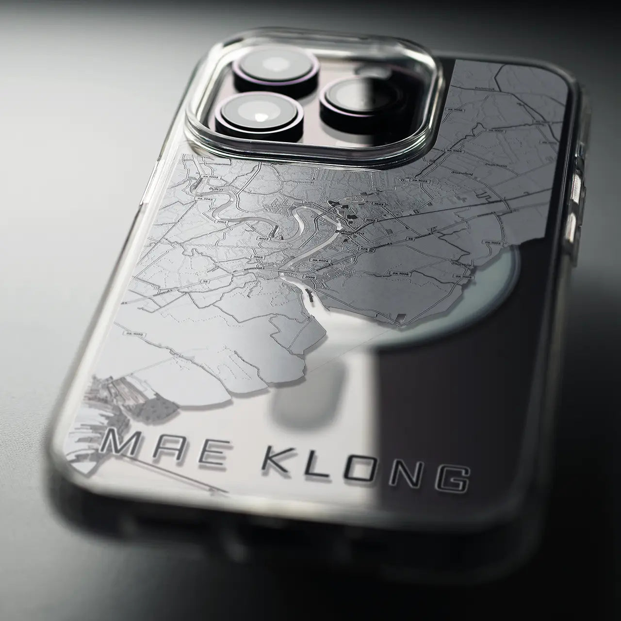 映画「戦場にかける橋」で有名なクウェー川の河口メークロンはバンコクから南西に延びる鉄道の終着駅。線路の両脇には1980年代から野菜や果物を売る店が集まり、いつしか地元の生活を支える市場となりました。列車が来るとレールの際まで並べた商品はそのままにテントをたたんで通過を待ち、その後は何事もなかったように商売を再開します。日本では想像できませんが、タイの人たちのおおらかさを象徴する光景といえます。あなたが愛する「メークロン」のMagSafeタイプ地図柄iPhoneケースです。ワンランク上のクオリティで、あなたの街「メークロン」への愛着も一層深まります。