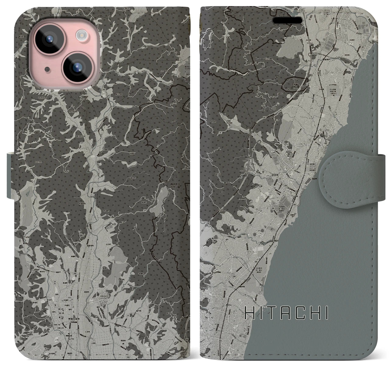 【日立(茨城県)】地図柄iPhoneケース(手帳タイプ)モノトーン・iPhone 15 Plus 用