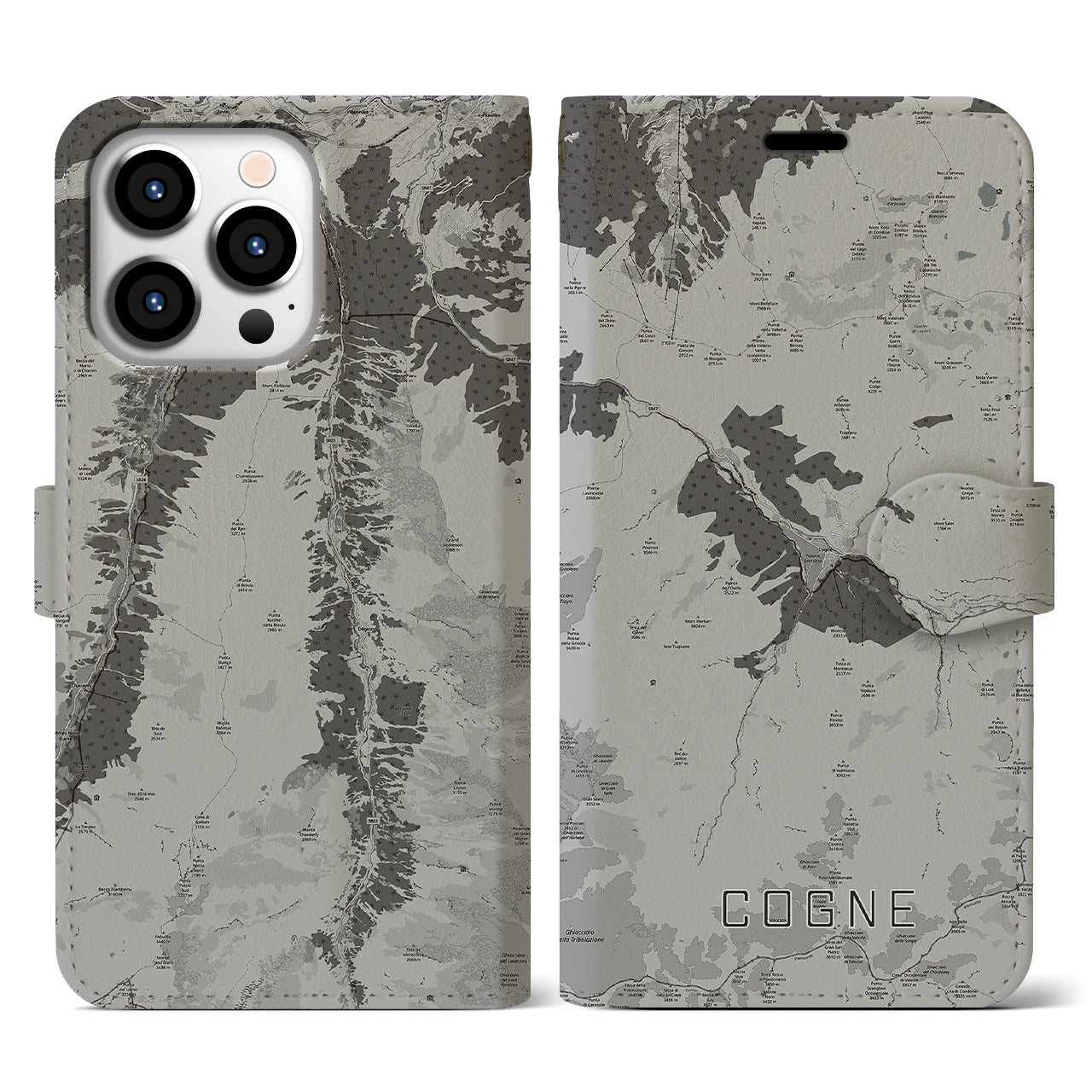 【コーニュ(イタリア)】地図柄iPhoneケース(手帳タイプ)モノトーン・iPhone 13 Pro 用