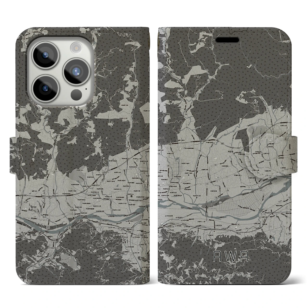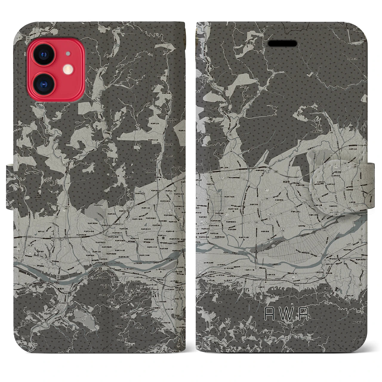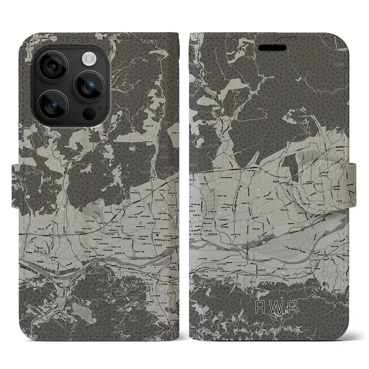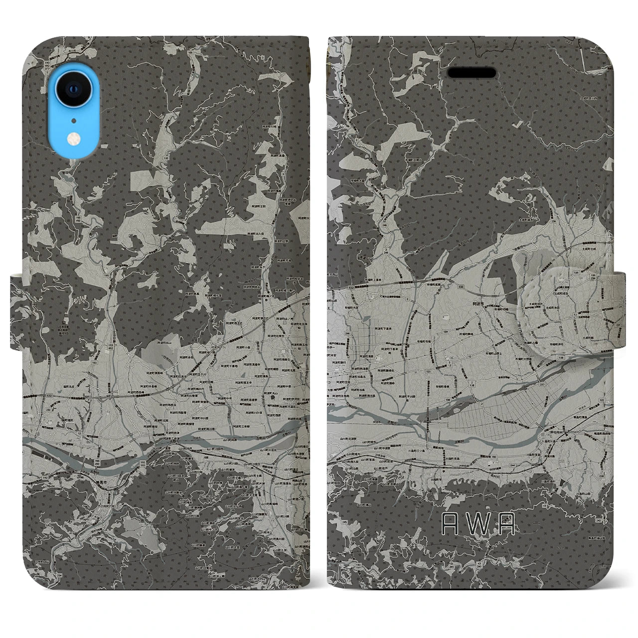 思い出の街、今を暮らす街、あなたが愛する「阿波」の手帳タイプ地図柄iPhoneケースです。両面にまたがる大きなプリントで、離れていても「阿波」をいつも身近に感じさせてくれます。