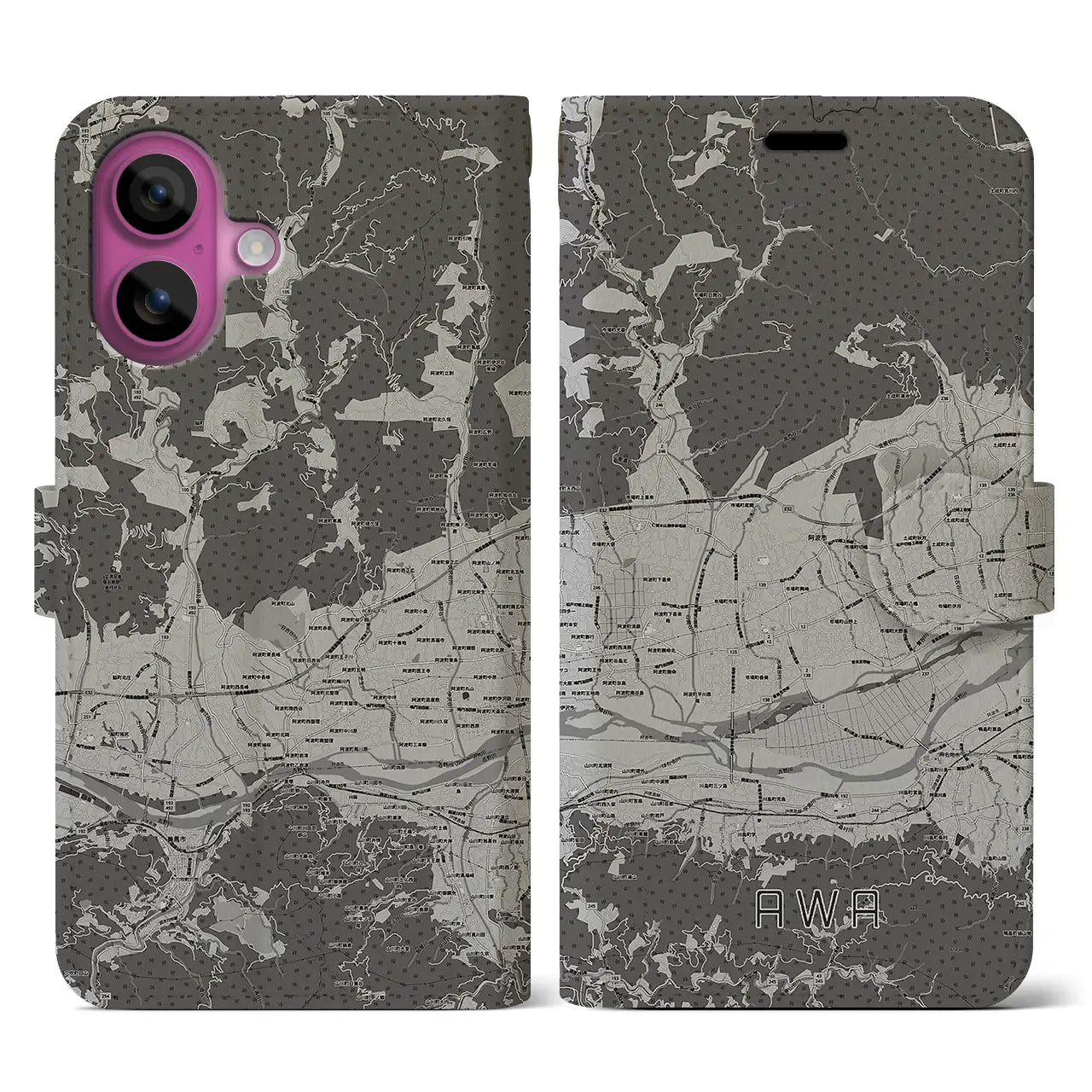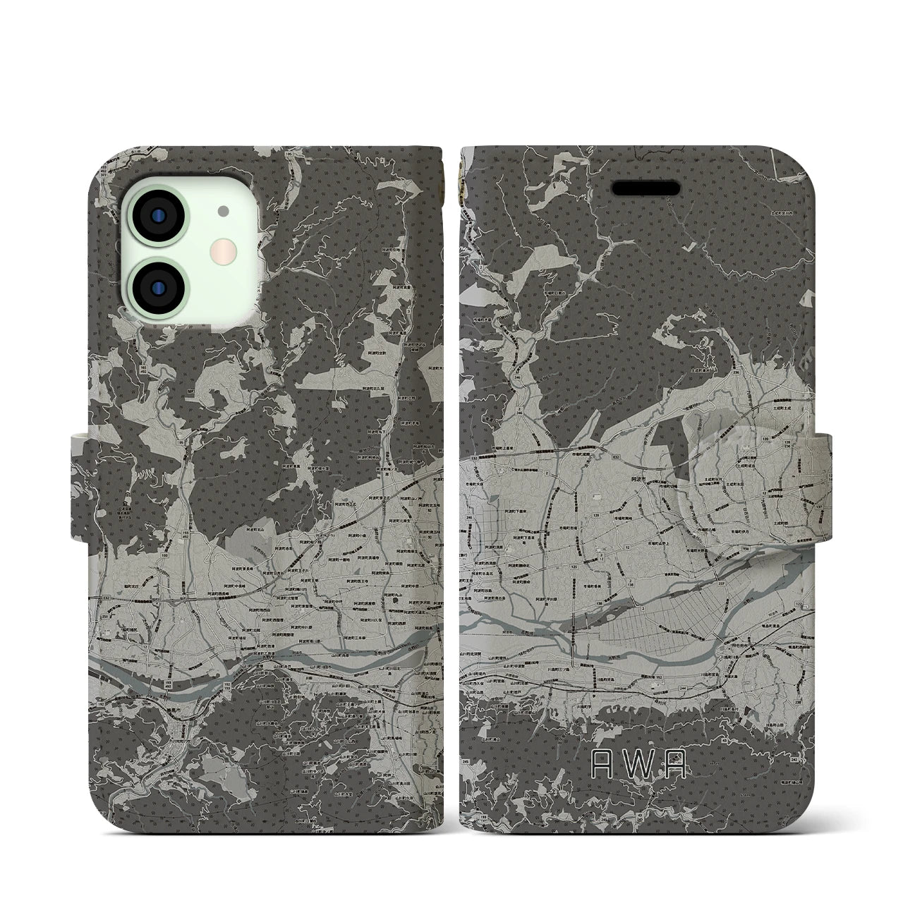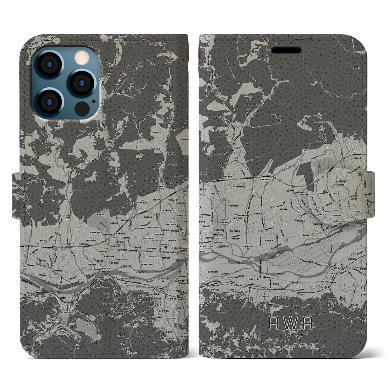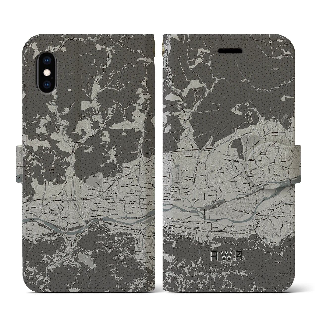 思い出の街、今を暮らす街、あなたが愛する「阿波」の手帳タイプ地図柄iPhoneケースです。両面にまたがる大きなプリントで、離れていても「阿波」をいつも身近に感じさせてくれます。