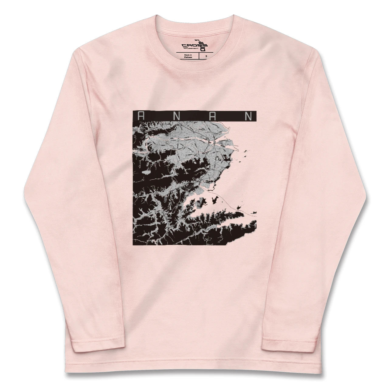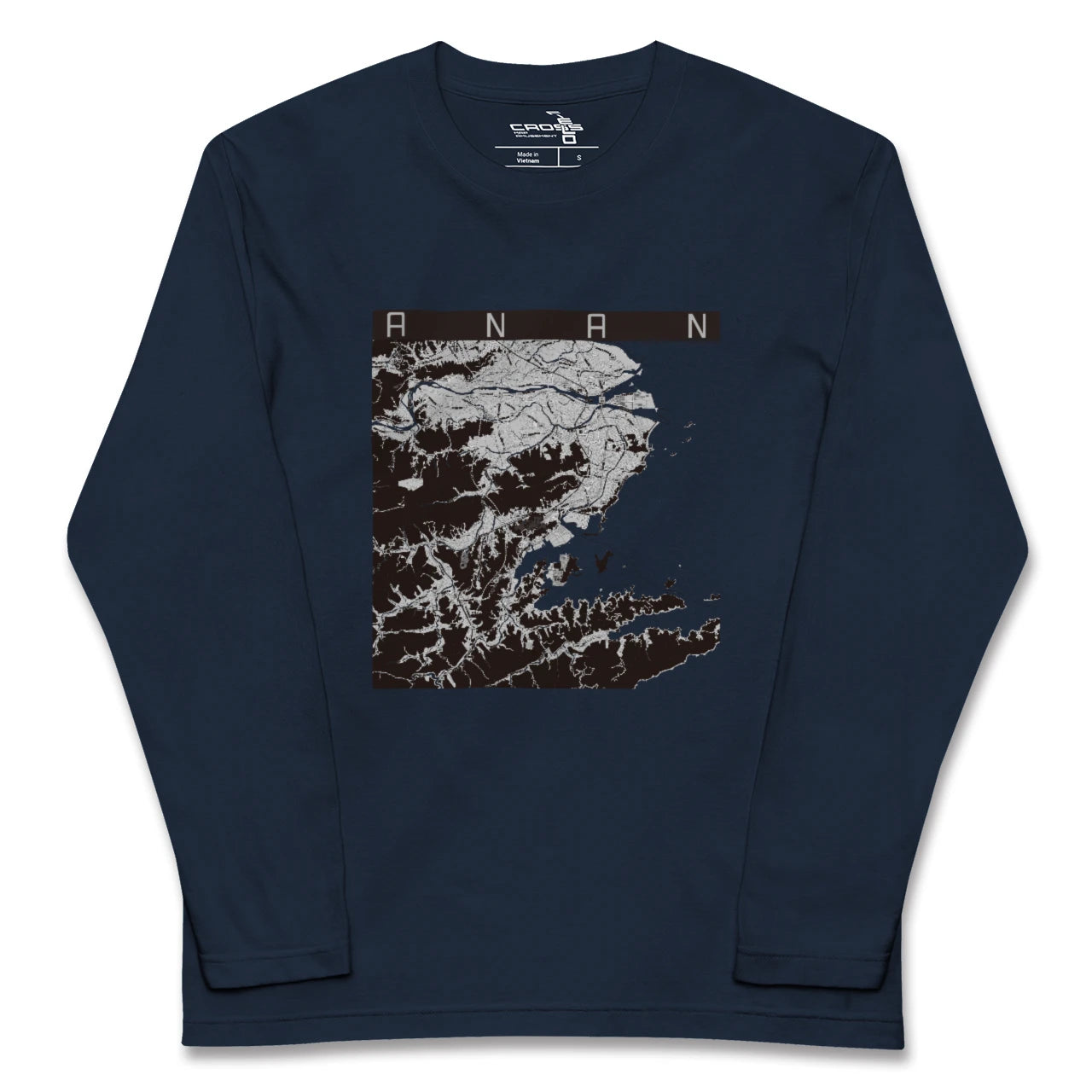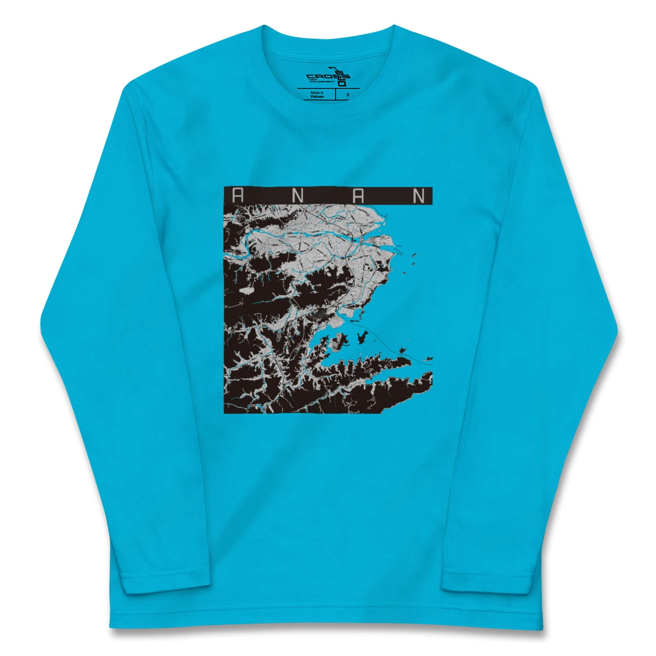 幅広いシーズンにフィットする長袖Tシャツにあなたの街「阿南」のモノトーンマップをプリントしました。