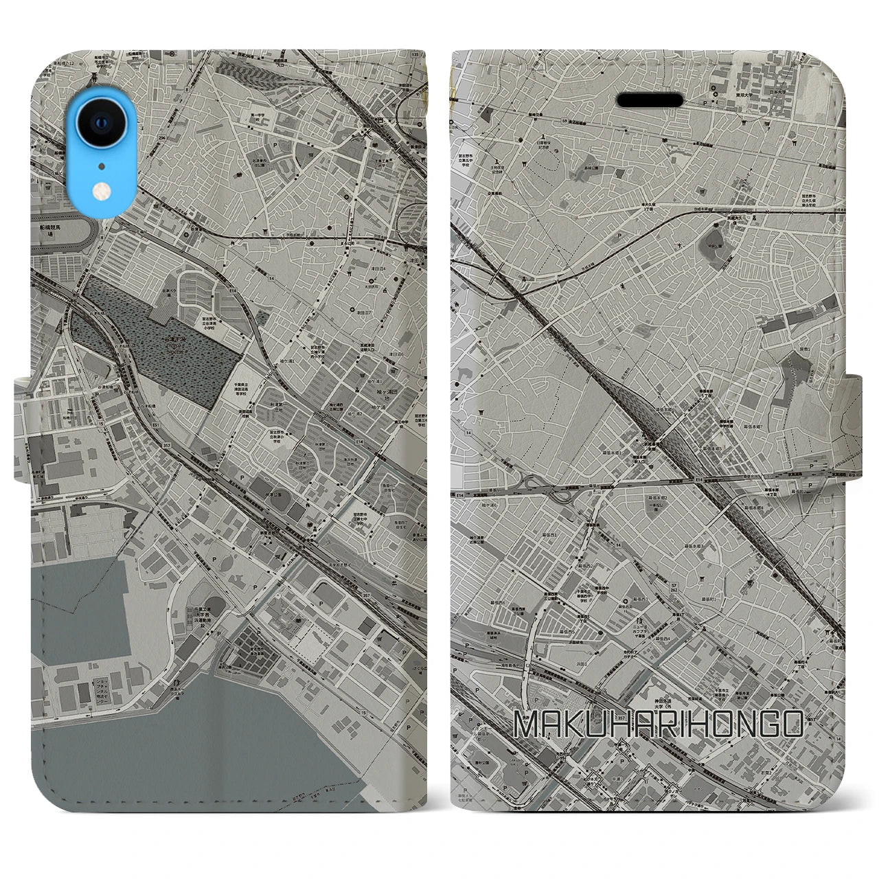 【幕張本郷(千葉県)】地図柄iPhoneケース(手帳タイプ)モノトーン・iPhone XR 用