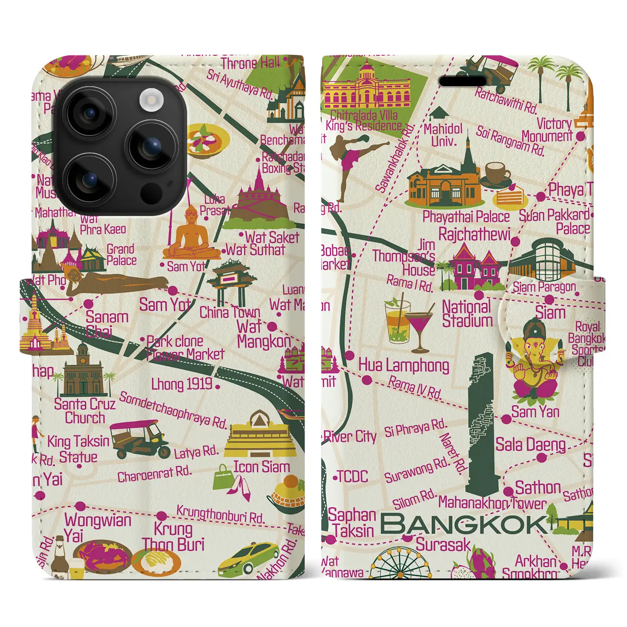 【バンコク(イラスト)】イラストマップiPhoneケース(手帳タイプ)ブライト・iPhone 16 Pro 用