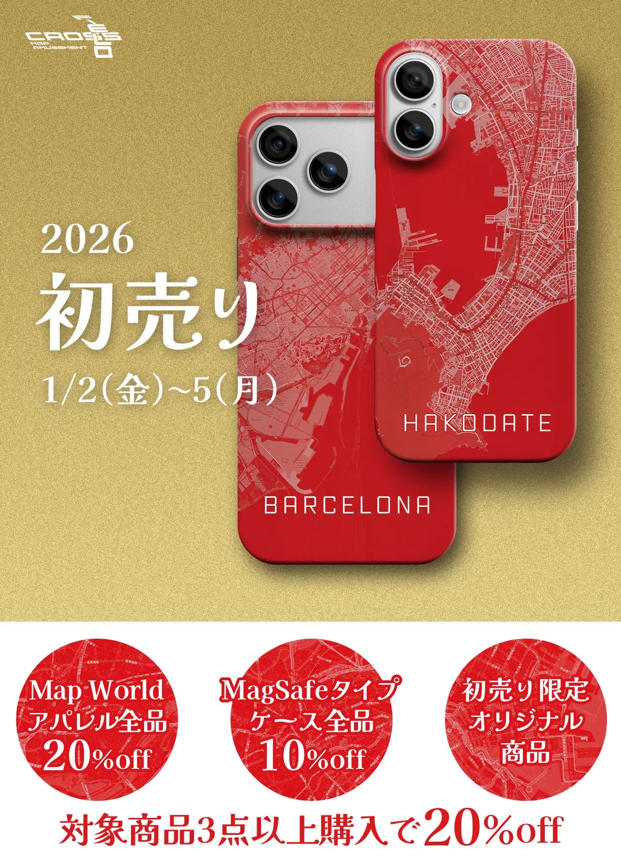初売り期間中はスマホケース、アパレルは組み合わせ自由3点以上のご購入で全品20%OFFに!
